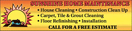 | At Your Service (415) 407-4044 www.AYSClean.net At Your Service is not just our name. We have been serving the Bay Area for over a decade with post construction services. We are insured. We use only environmentally safe cleaning products. We offer professional window cleaning services. Ask about our monthly maintenance plan. We will leave your home in a move in condition free of construction debris and dust. Give Us a Call For a FREE Estimate Today! | Sunshine Home Maintenance (415) 457-4363 Proudly serving the San Rafael & Surrounding Areas. We are a all around Home & Building Maintenance company as well as Flooring Contractors. We specialize in Everything from Hardwood Installation & Refinishing, Sealing & Hi-speed Polishing of all Floors, Carpet Cleaning & Installation, to Power Washing, Window Cleaning, Construction Clean ups, & Much More. Accepting All Major Credit Cards & Insurance. Open 7 Days a Week, 24 Hour Emergency Service Available. Contact us today! | Brenda’s Cleaning Personnel, Inc. (415) 453-3386 www.BrendasCleaning.com Founded in 1977, Brenda's Cleaning Personnel, Inc. began with just a few cleaners operating in Marin County and offering basic housecleaning only. As the years passed, demand for a wider variety of services grew. Now Brenda's offers a full range of home maintenance professionals. At Brenda's you will find a wide selection of possibilities: from standard housecleaning, all the way to exterior cleaning, construction cleaning or home detailing. Our mission is to provide a complete range of maintenance services for the home, at an affordable cost. We realize that a fine housecleaning job affects our customers daily lives: basic schedules, numerous obligations or health and physical concerns. With a clean home, our clients have a foundation on which to face the daily demands made in their lives.     |